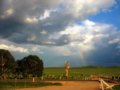 傍晚,上海男生还沉浸在看赛马的激动中,要求出去骑马,我们带着姐姐的才3个月大的高加索犬“纳仁”出去看原上彩虹客栈后面丘陵上的总理题词碑。从那里开始的一万亩草场就是几年前在太仆寺旗建立的生态保护实验区——万亩草库仑,这里被圈起禁止放牧,所以牧草极茂盛,盛夏时节草高花繁,鲜蘑遍地,雨水多时湖波映日。所以朱熔基总理选择在这丘陵顶端树立了一块提醒世人保护环境的纪念碑。果然登高望远,草原连绵,浅山起伏一层层的绿浪,只是尚未到牧草最繁盛时节,不过已经非常迷人了。但是晚霞却没有看到,果然如姐姐说的,祭敖包日必有雨,乌云遮住了暮日,几个客人在客栈看见的巨美的落霞照片上的风景,这番没机会见了。不过他们说如果有机会,一定再来。