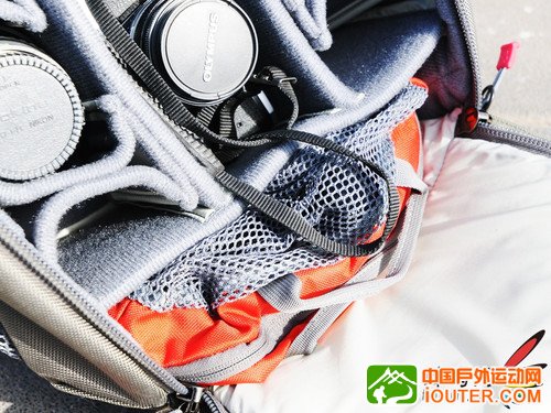 从收纳格的设计上,ESCAPE更加人性化,对于顶部机身镜头一体的存放位置,没有采用普通的松紧带固定,而是专门做了符合机身工学的固定方式,这就是为什么当我们只打开主包顶部的时候,我们会感觉顶部就是一个独立的存放空间。